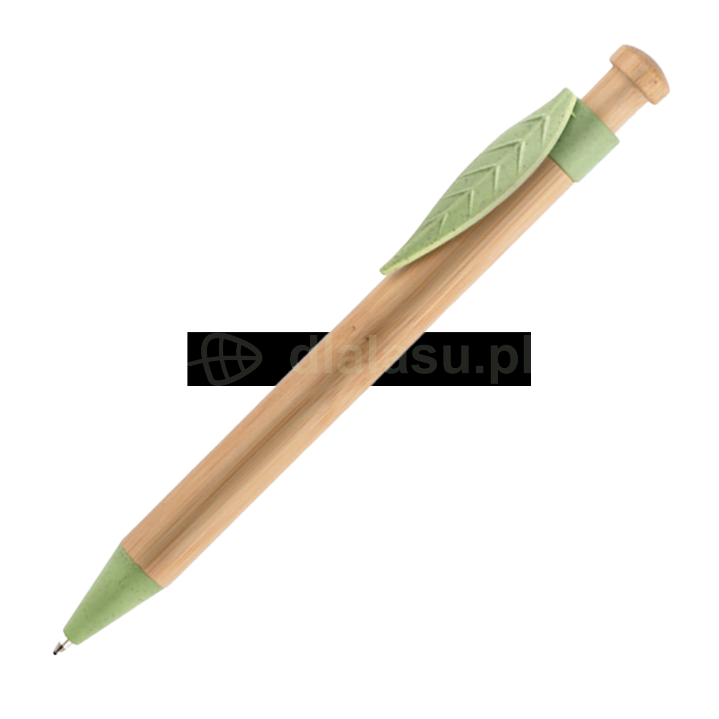 Ekologiczny długopis wykonany z naturalnego bambusa, z klipem w kształcie liścia i elementami z tworzywa zawierającego 40% naturalnej słomy.