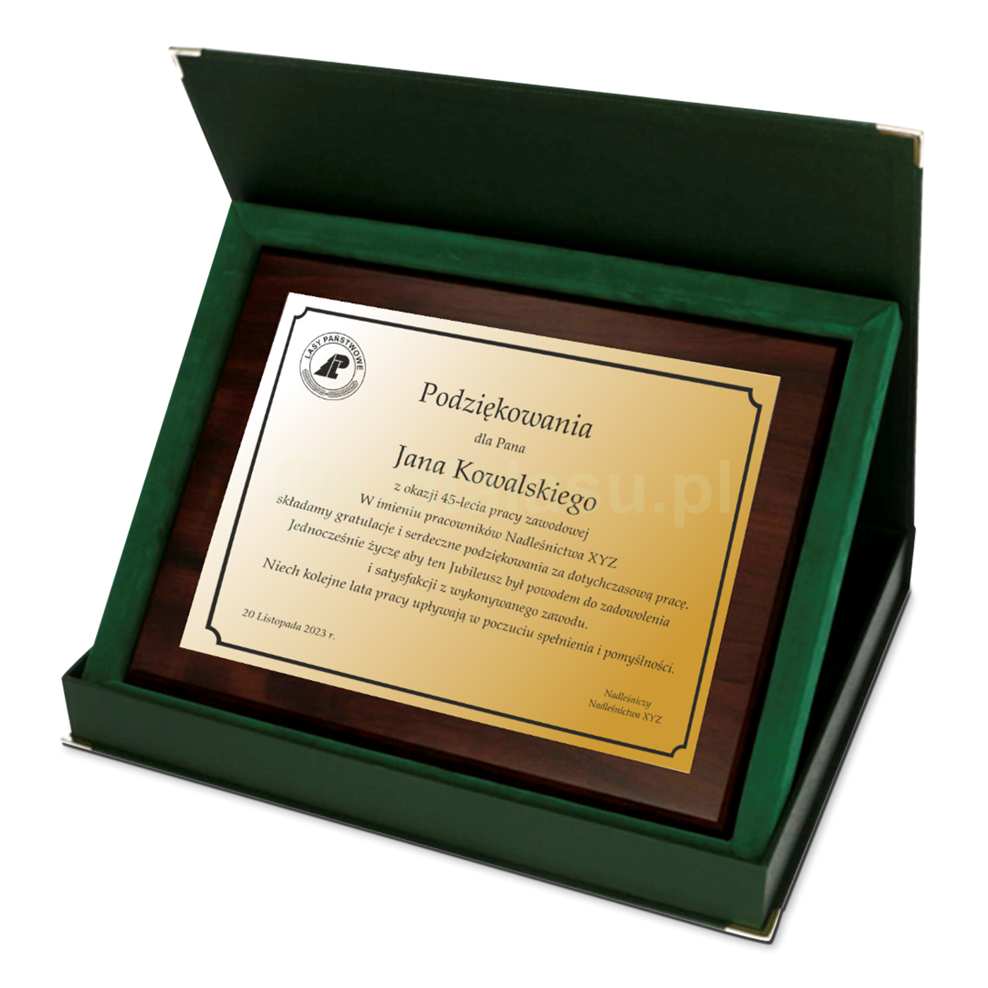 Elegancki grawerton z laminatu w kolorze złotym lub srebrnym na drewnianym podkładzie, idealny jako prezent dla partnerów biznesowych, przełożonych i pracowników. Dostępny z grawerem podziękowań, w eleganckim etui (zielonym, czerwonym, granatowym lub czarnym) i różnych rozmiarach.
