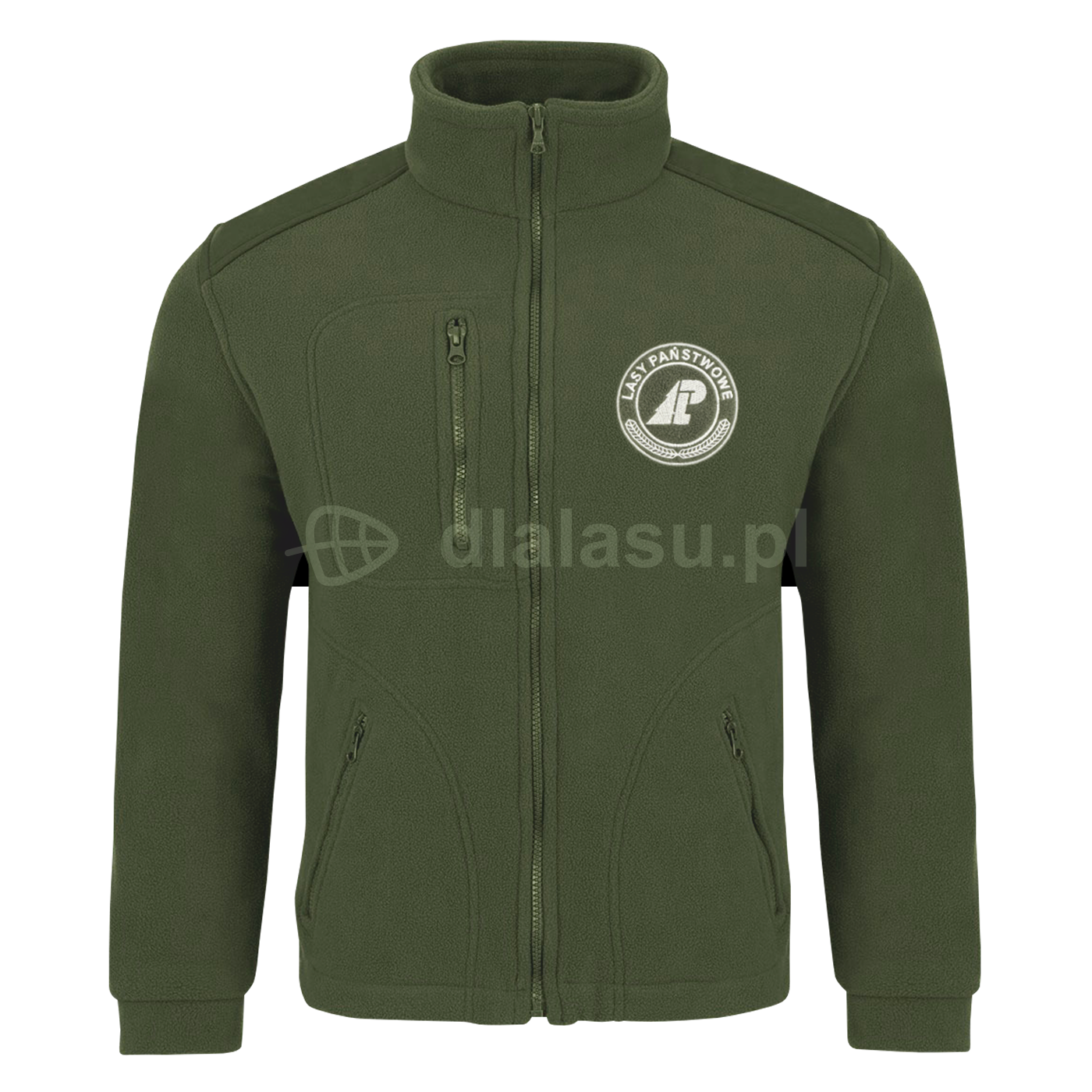Trwała bluza z grubej tkaniny polarowej, idealna na chłodne dni. Wyposażona w zamki, kieszenie i haft z logo Lasów Państwowych.