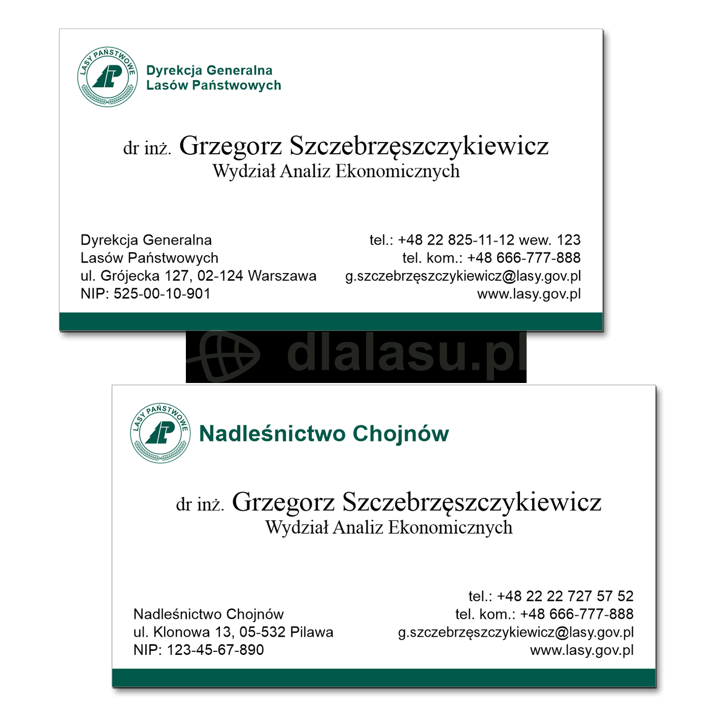 Wizytówki w formacie 90 x 50 mm z matowego papieru kredowego 350 g, z jednostronnym drukiem. Wzory zgodne z Księgą Identyfikacji Wizualnej PGL.