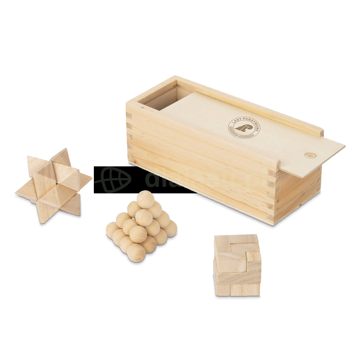 Zestaw trzech drewnianych układanek Tricky w pudełku z grawerowanym logo – kreatywny i elegancki gadżet, który wyróżni Twoją markę.